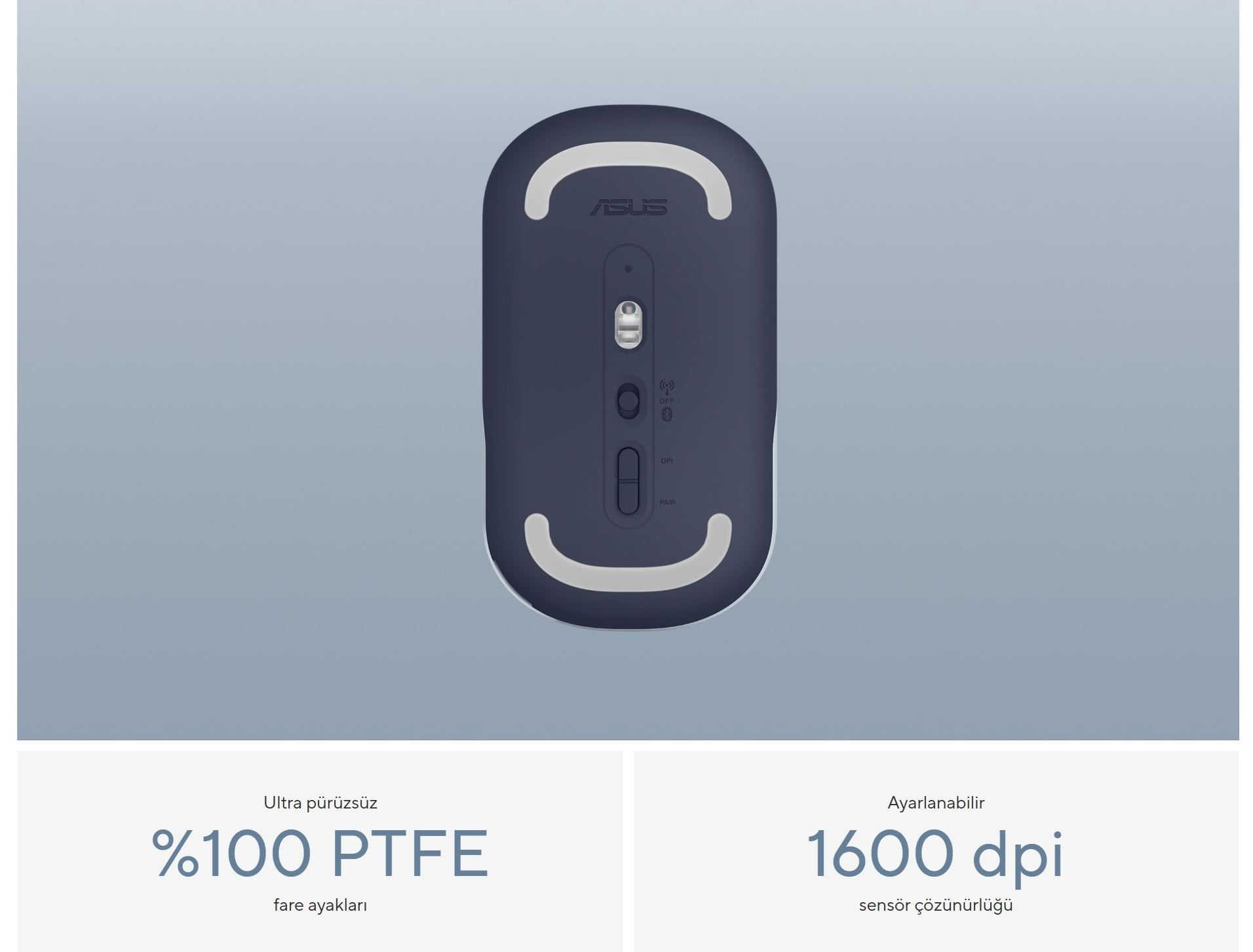 Kompakt ASUS Marshmallow Mouse MD100 Lite, taşımayı kolaylaştıran kullanışlı bir kayışa sahiptir. Enerji tasarruflu bu fare, tek bir AA pil ile bir yıla kadar dayanır¹ ve 10 milyon tıklama ömrüne sahip tuşlara sahiptir. Bir düğmeye hızlıca basarak üç DPI seviyesi arasında geçiş yapabilirsiniz ve %100 PTFE fare ayakları, düz yüzeylerde pürüzsüz bir kayma sağlar.