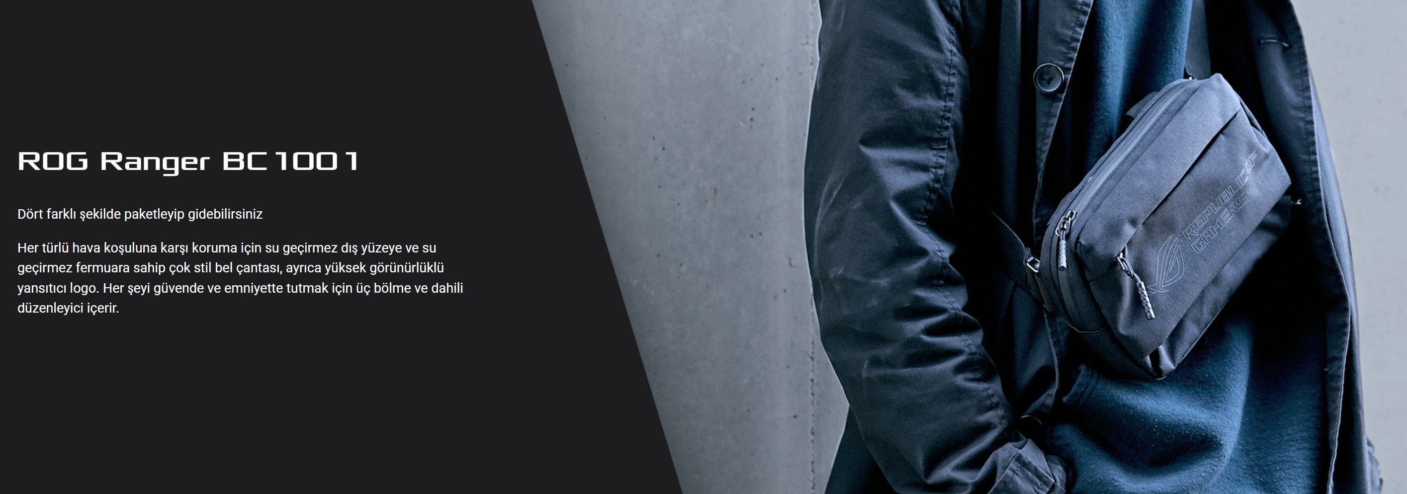 ROG Ranger BC1001 çok stil bel çantası, su tutmayan dış yüzey, su geçirmez fermuar, yansıtıcı logo ve kolay düzenleme için üç bölmeye sahiptir.