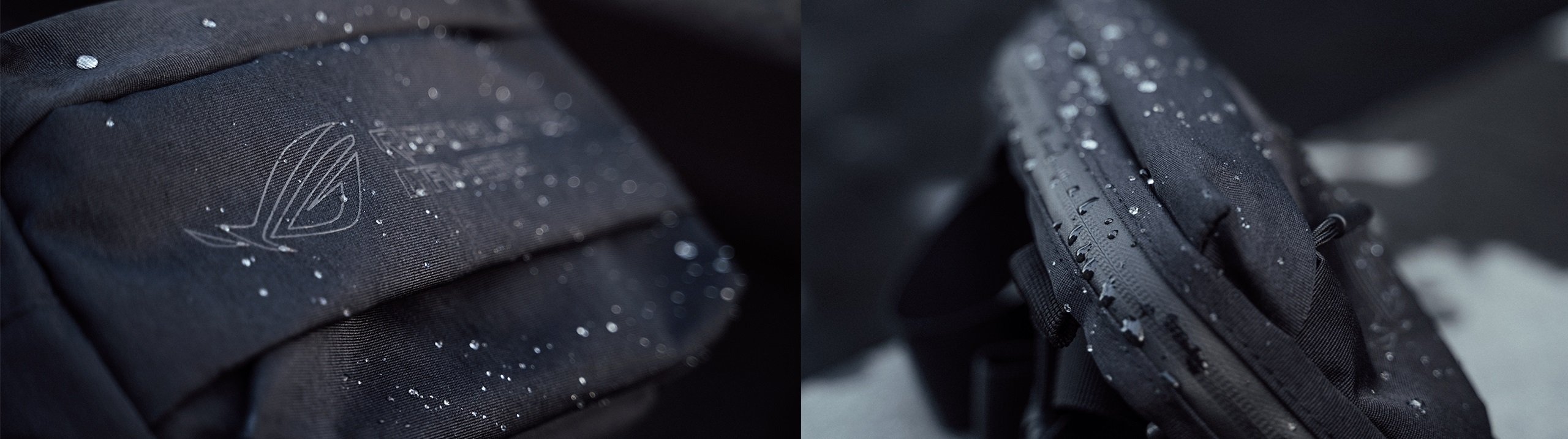 Dayanıklı 600D polyesterden dokunmuş ROG Ranger BC1001'in dış yüzeyi su iticidir; böylece günlük duşlar ve sıçramalar konusunda endişelenmenize gerek kalmaz. Fermuar tamamen su geçirmezdir, nemi dışarıda tutar ve içindekileri kuru tutar.