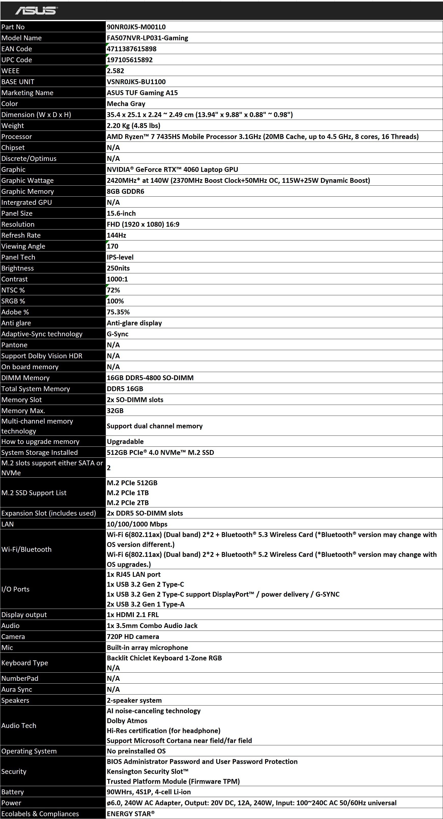 Asus TUF Gaming A15 FA507NVR-LP031 8GB RTX4060 140w Ryzen 7 7435HS 16GB RAM 512GB SSD 15.6 inç FHD 144Hz