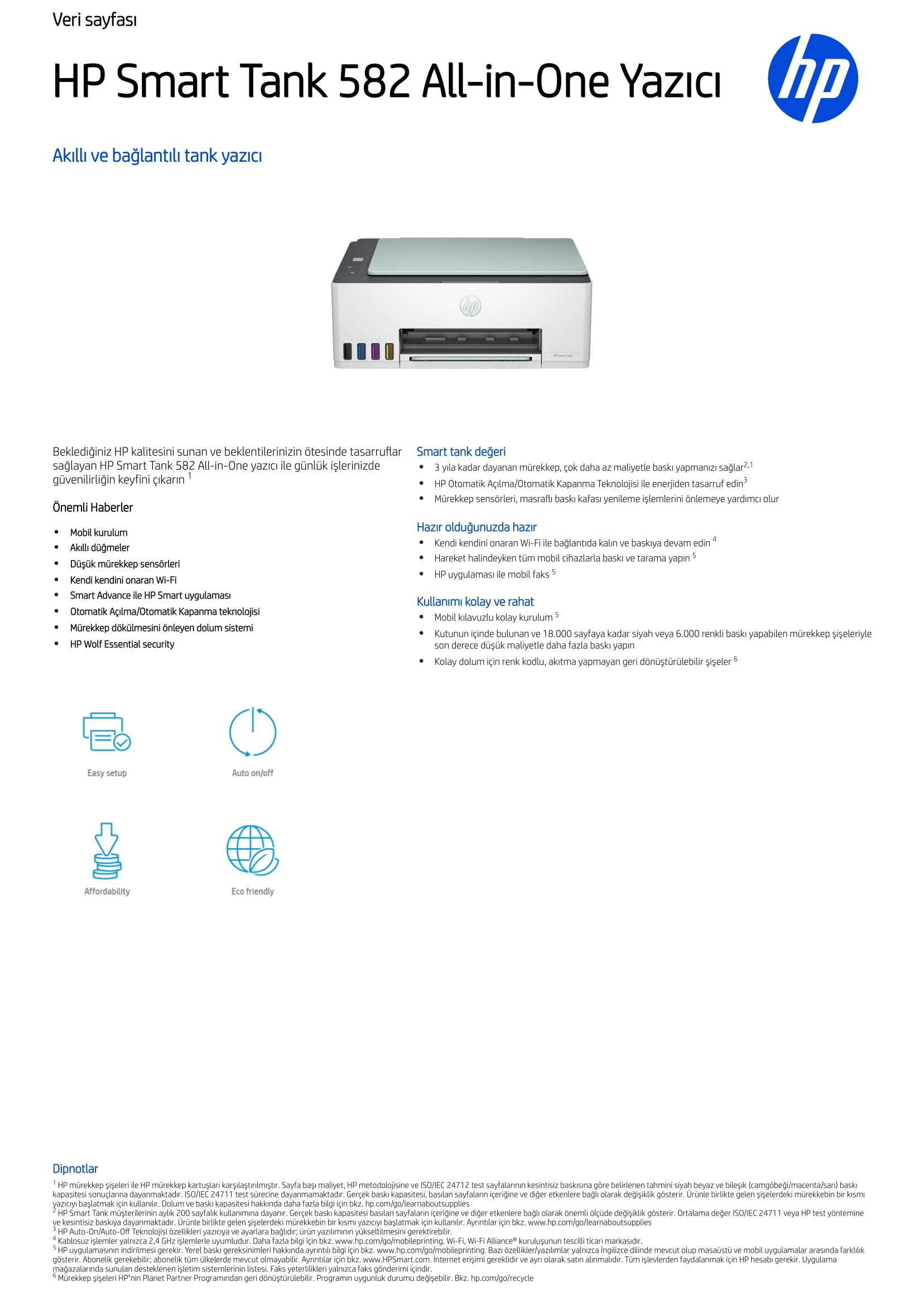 HP Smart Tank 582 Fotokopi + Tarayıcı + Wi-Fi + AirPrint Renkli Tanklı Yazıcı 4A8D6A