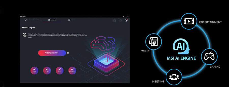 - MSI AI Engine ihtiyaçlarınıza en iyi şekilde uyum sağlamak için farklı sistem ayarlarını otomatik olarak yapar.