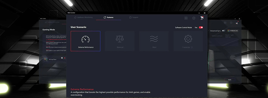 MSI Center kullanıcılara birkaç farklı performans profili sunar. Extreme Performance modunu tercih ettiğinzde MSI Gaming Desktop bilgisayarın nihai performansını deneyimleyebilirsiniz.